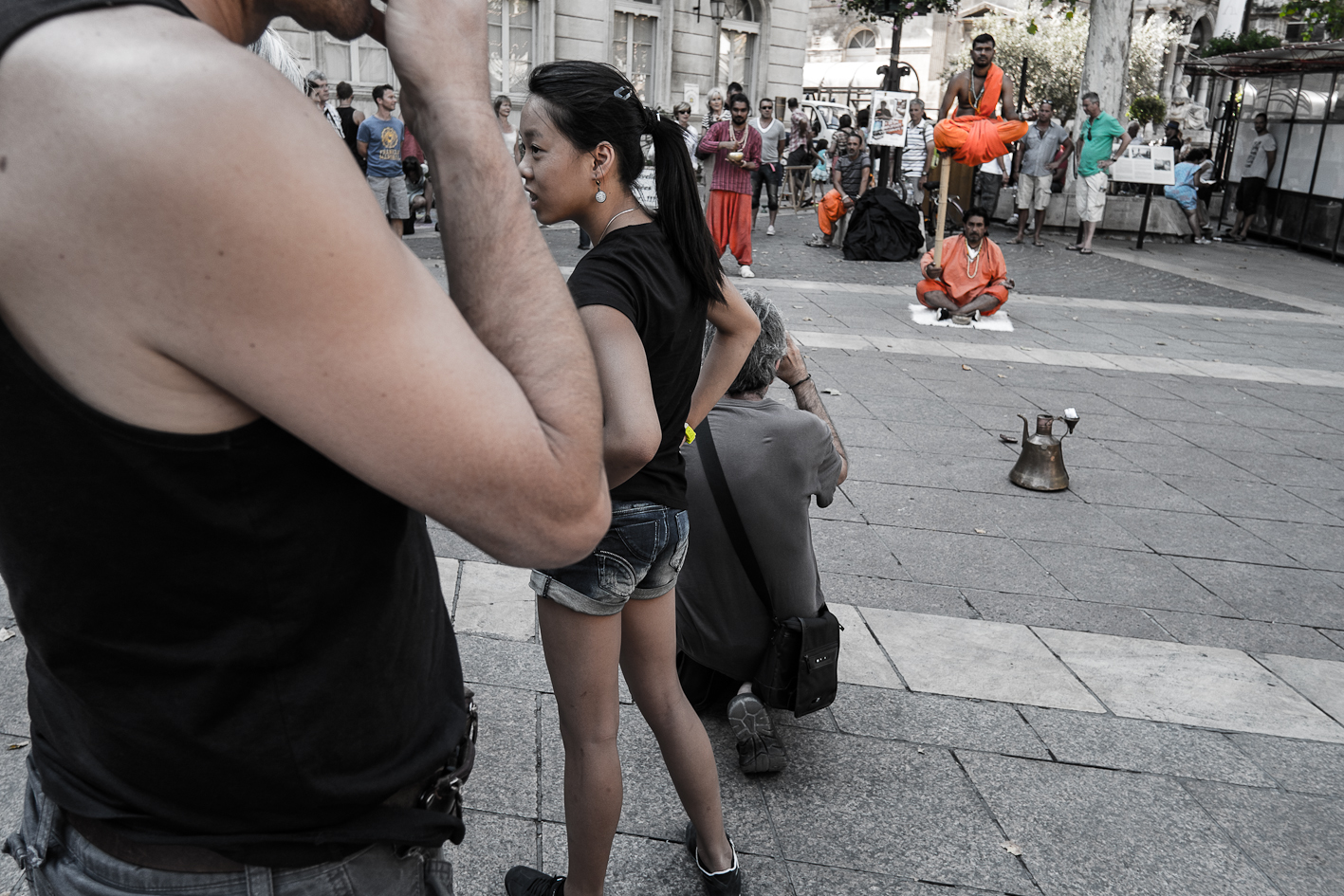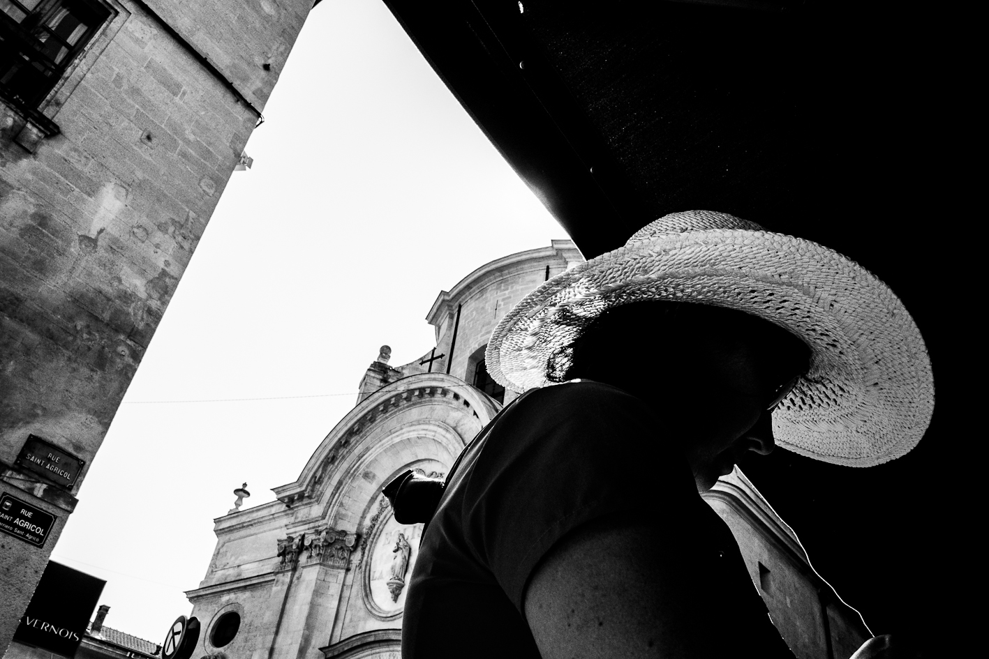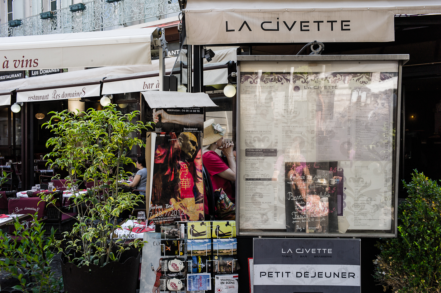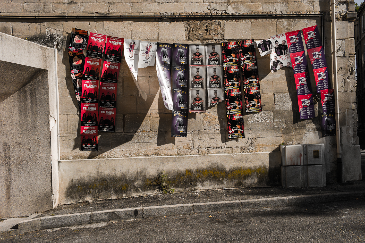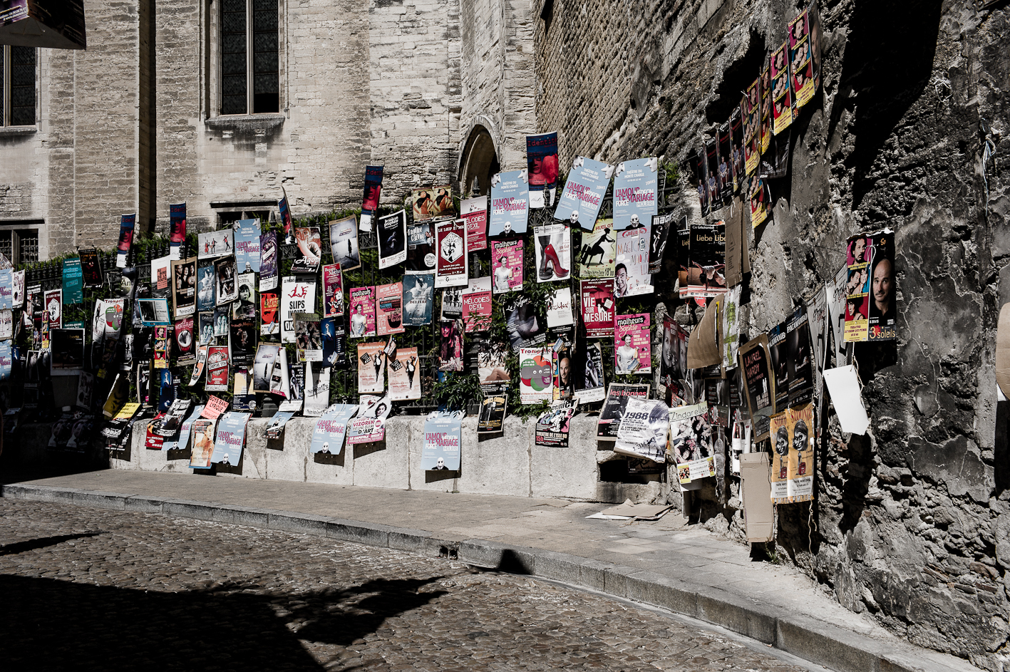 Avignon… gnongnon…Il y fait chaud et il y a un festival de theâtre. J’y suis depuis hier… à Avignon, pas vraiment au festival… Cependant, il faut reconnaître qu’il y a du spectacle vivant et du moins vivant… récapitulons donc une journée. Vers neuf heures, c’est la fin de la nuit pour certains, début d’une chaude journée pour d’autres, on croise des théâtreux sur le pied de guerre, des femmes courtes vêtues et transparées pour mon plus grand plaisir. Dix heures, les spectacles commencent, des touristes, pardon, des festivaliers font la queue devant des théâtres, certains petits d’autres petits… la cour d’honneur du palais des Papes c’est plutôt le soir. Dans la rue commence la distribution des flyers, c’est un peu comme les bons de réductions en bout de gondole dans votre supermarché, si ce n’est que les jeunes filles qui vous les distribuent sont courtes vêtues et transparées… pour mon plus grand plaisir. la chaleur monte, l’alongueur des robes aussi, je lis un des flyers, je ne comprends pas il est en japonais… Onze heures, tout bat son plein, il y a tellement de distributuons de flyers devant l’office du tourisme que je n’ai plus de place dans mon sac pour y placer le plan de la ville… certains flyers sont courts et transparés… pour mon plus grand plaisir. Midi, on déjeune, les femmes croisent les jambes en s’asseyant d’autres lisent leurs flyers, d’aucuns les ramassent à la pelle, vêtus d’un pantalon de travail vert et d’un gilet jaune fluo… pour leur plus grand ennui. treize heures, sieste en ce qui me concerne, mais j’ai l’intention de me rendre à un spectacle après… Vers quinze heures, je ressors, la foule est là sous la chaleur, elle tourne, elle roule, elle marche et le spectacle est dans la rue, les troupes défilent costumées, d’autres donnent des extraits de leur spectacle pour que l’on vienne les voir… Ça grouille, ça pue… je trouve refuge dans une église où je fais brûler un cierge à Saint Antoine de Padoue, dont j’apprends qu’il mourut d’épuisement… une jeune femme, dont j’entends la voix, travaille sur l’orgue un extrait que je crois être de Vierne, je n’en suis pas certain, mais je suis seul, dans la pénombre trente minutes durant, elle joue puissament, j’écoute fébrilement. Seize heures, à nouveau dans la rue, j’écoute des musiques, je regarde des présentations de spectacle, je recueille des flyers, je sens des odeurs de sueur, je photographie les vides laissés pas ce spectacle des autres… les femmes sentent toujours bon. Arrive la nuit qui marque le début de rien de plus que l’absence de lumière, l’orchestre Bulgaro-Roumain joue toujours aussi fort, ma voisine a de jolies cuisses qu’elle dévoile sans pudeur, il est vrai que ce petit courant d’air fait du bien à l’entrejambe… quelques heures de sommeil et j’assiste à mon premier spectacle, sept heures du matin, jmenbatslescouilles et tumfaispleurer, en direct de dessous ma fenêtre jouent une pièce dont je ne connais pas l’auteur mais dont le titre est « descente… caïne », je leur lancerais bien mon kilo de flyer sur la gueule pour marquer mon enthousiasme… mais ils quittent la scène chacun de leur côté… Donc dans culture, il y a ture et… pour mon plus grand plaisir… Ah oui chercher un con aujourd’hui… je caresserais bien la visage de la femme que j’aime…