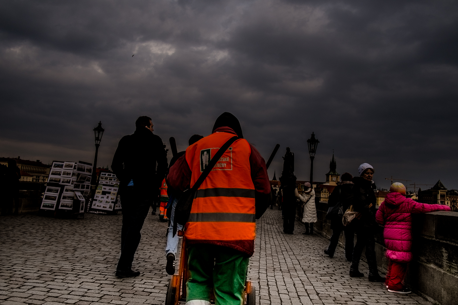 Seize heures, je suis de retour, les vieux Japonais sont rentrés ou ils sont déjà couchés…il reste les Chinois… Alors là, je tire mon chapeau à une petite dame chinoise qui est la reine de la photo touristique… Sur le pont le plus célèbre de Prague, mon regard est attiré par un petit groupe sautillant qui s’arrête tous les cinq mètres. Je l’appellerai madame Ming. Madame Ming s’arrête tous les cinq mètres en s’agenouillant sur un seul genou pour photographier chacun des membres de son groupe (ils sont onze après décompte) de chaque côté du pont… devant des statues, devant rien, avec un touriste, avec un vendeur de souvenirs même s’il ne veut pas, elle le prend par le bras avec force, la bougresse… Je les suis sur une vingtaine de mètres. Nous disons donc ((4×11)x2)x5=440 photos ce qui représente autant de génuflexions, parce qu’elle se relève à chaque fois et s’agenouille pour mieux cadrer… et ses onze apôtres ne disent rien, ils obtempèrent en silence chinois, parce qu’elle gueule en plus quand il en manque un… si fort et haut, qu’on ne peut que comprendre… celui qui a failli arrive en courant… Chapeau bas…je me sauve pour une bière méritée…